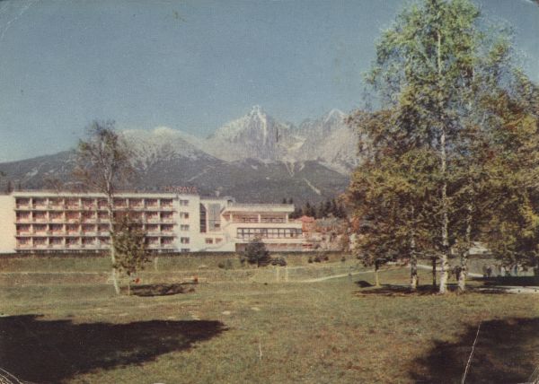 VYSOKÉ TATRY - Tatranská Lomnica Zotavovňa ROH Morava. V pozadí Lomnický ątít (2634 m) a Keľmarský ątít (2556 m)