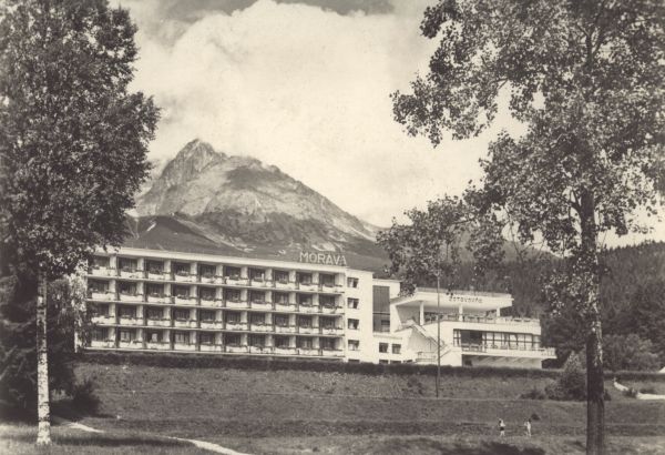 Budynek związkowego domu wypoczynkowego Morawa w Tatrzańskiej Łomnicy i jego otoczenie. W tle Kieżmarski Szczyt. Na pierwszym planie drzewa liściaste.