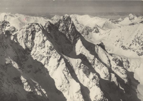 Widok z Rysów na Mięguszowieckie Szczyty w zimowej scenerii.
