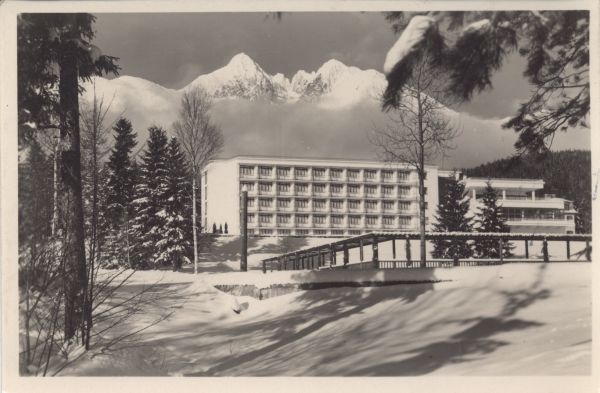 Tatrzańska Łomnica. Związkowy Dom Wypoczynkowy Morawa w zimowej scenerii. W tle Łomnica i Kieżmarski Szczyt.