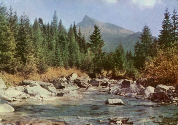 ČSSR - VYSOKÉ TATRY - HIGH TATRAS Pohľad na Kriváň (2494 m) od Podbanského. V popredí riečka Belá.