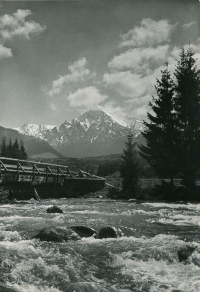 Widok na Krywań z Podbańskiej. Na pierwszym planie rzeka Biała Liptowska, po lewej stronie drewniany most. W tle zaśnieżony masyw Krywania.