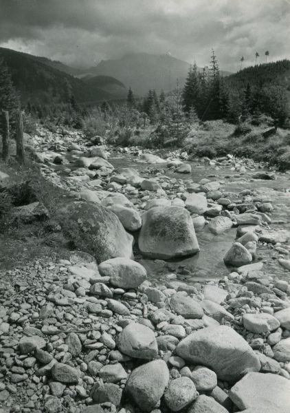 Potok Biała Liptowska koło Podbańskiej. Na pierwszym planie koryto potoku w czasie niskiego stanu wody. W głębi las, w tle Krywań.
