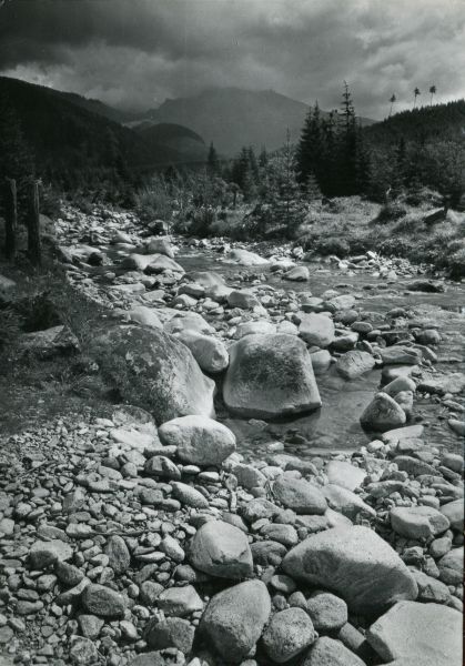 Potok Biała Liptowska koło Podbańskiej. Na pierwszym planie koryto potoku w czasie niskiego stanu wody. W głębi las, w tle Krywań.