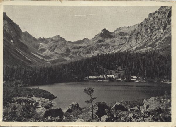 Mięguszowiecka Dolina, Popradzki Staw. Na przeciwległym brzegu schronisko nad Popradzkim Stawem. W tle Koprowy Wierch, Cubryna, Mięguszowiecki Szczyt, Wołowy Grzbiet.