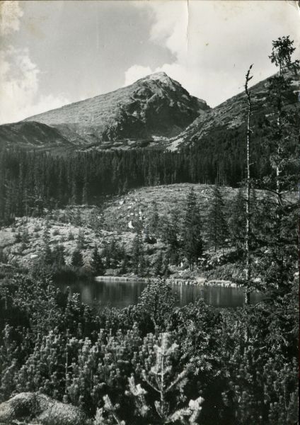Widok na Krywań znad Jamskiego Stawu. Na pierwszym kosodrzewina, za nią staw, w głębi las.