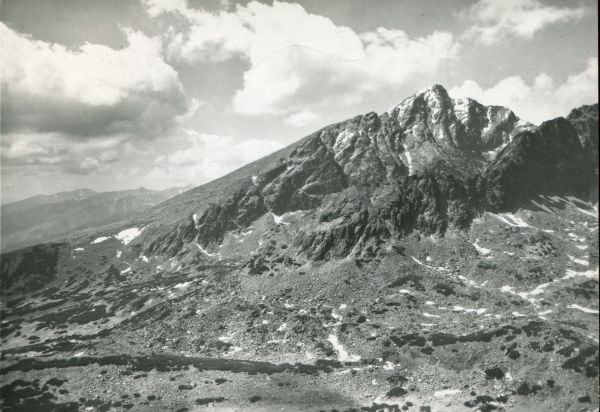 Tatry Wysokie Widok z Siodełka (Siodełkowej Kopy) na Krywań, profil głowy Indianina. Tytuł również w języku: ros., niem., ang.