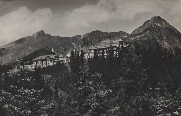 Zabudowania hotelowe w Szczyrbskim Jeziorze, w tle od lewej Krywań, Krótka, Ostra i Wielkie Solisko.