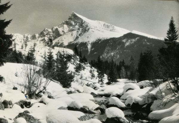 Widok na Krywań z Doliny Koprowej w zimie. Na pierwszym planie potok Koprowa Woda.