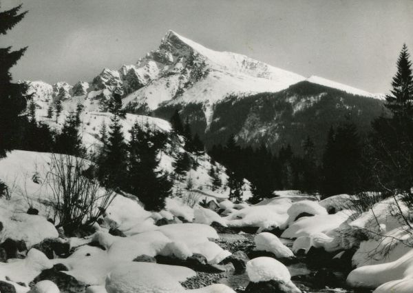 Widok na Krywań z Doliny Koprowej w zimie. Na pierwszym planie potok Koprowa Woda.