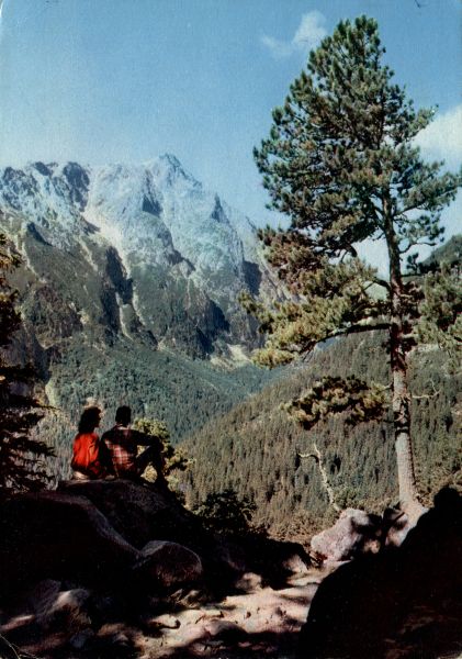 Widok na Sławkowski Szczyt z Magistrali Tatrzańskiej. Na pierwszym planie 2 turystów i limba (Pinus cembra L.).