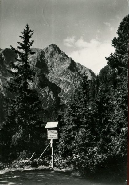 Widok na Sławkowski Szczyt z Magistrali Tatrzańskiej. Na pierwszym planie kierunkowskaz turystyczny, za nim las.