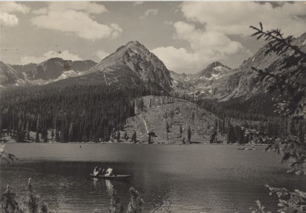 Szczyrbskie Jezioro, na pierwszym planie łódka, w tle Ostra, Wielkie Solisko, Szczyrbski Szczyt i Grań Baszt.