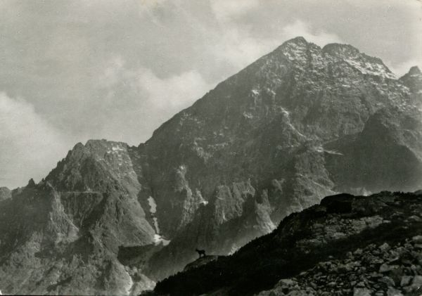 Widok z Doliny Jagnięcej na północn± ¶cianę Małego Kieżmarskiego Szczytu. Na pierwszym planie na skale kozica (Rupicapra rupicapra). W tle od lewej strony: Kieżmarska Kopa, Mały Kieżmarski Szczyt, Kieżmarski Szczyt i Łomnica.