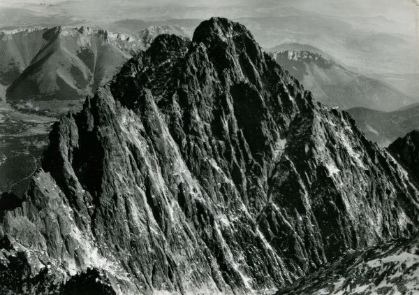 Widok z Łomnicy na Kieżmarski Szczyt i Mały Kieżmarski Szczyt. W tle Tatry Bielskie.