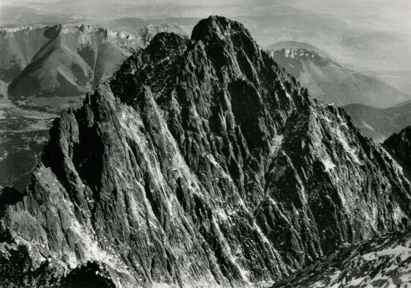 Widok z Łomnicy na Kieżmarski Szczyt i Mały Kieżmarski Szczyt. W tle Tatry Bielskie.