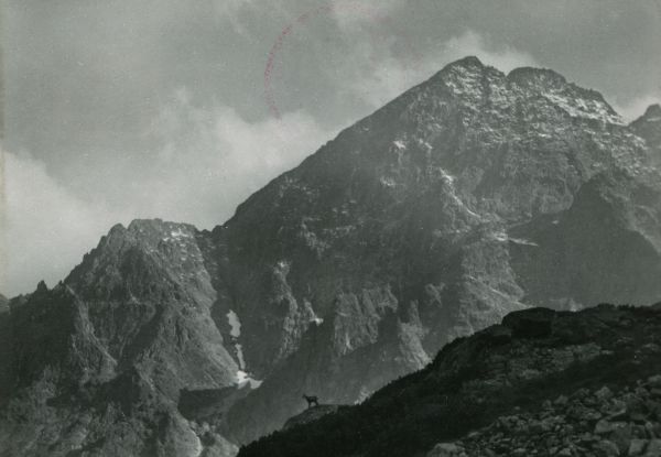 Widok z Doliny Jagnięcej na północn± ¶cianę Małego Kieżmarskiego Szczytu. Na pierwszym planie na skale kozica (rupicapra rupicapra). W tle od lewej strony: Kieżmarska Kopa, Mały Kieżmarski Szczyt, Kieżmarski Szczyt i Łomnica.