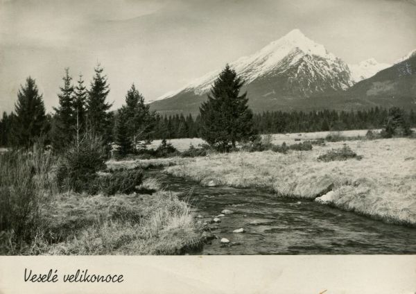 Widok na ośnieżony Sławkowski Szczyt. Na pierwszym planie potok. W głębi las. Pod zdjęciem życzenia: Veselé velikonoce.
