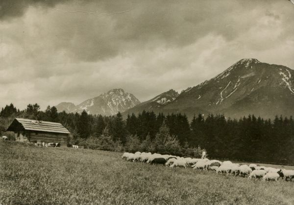 Widok na Sławkowski Szczyt. Na pierwszym planie łąka na, której pasą się owce. Po lewej stronie bacówka. W głębi las.