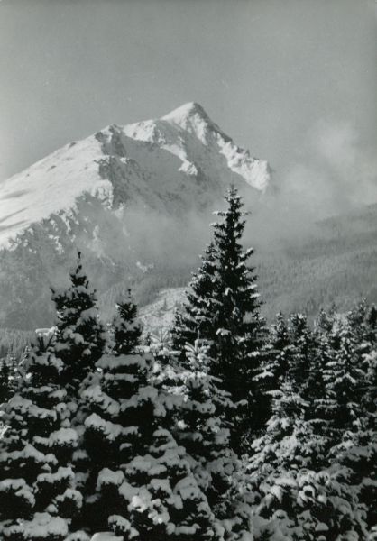 Widok z Tatrzańskiej Łomnicy na Sławkowski Szczyt w scenerii zimowej. Na pierwszym planie o¶nieżone ¶wierki (Picea A. Dietr.).