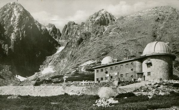 Widok na budynek obserwatorium astronomicznego Słowackiej Akademii Nauk w Dolinie Łomnickiej. W tle Łomnica, Widły i Kieżmarski Szczyt. Na pierwszym planie kosodrzewina (Pinus mugo Turra).