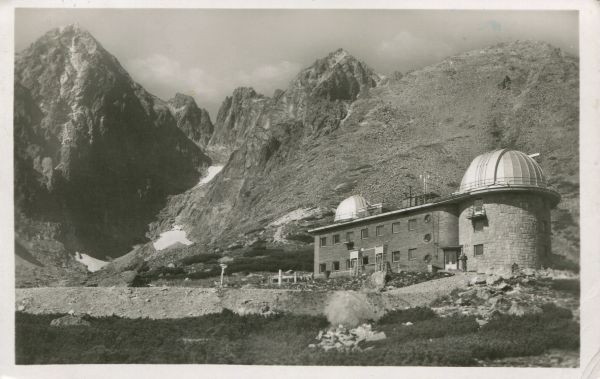 Widok na budynek Państwowego Obserwatorium Astronomicznego w Dolinie Łomnickiej. W tle Łomnica, Widły i Kieżmarski Szczyt. Na pierwszym planie kosodrzewina (Pinus mugo Turra).