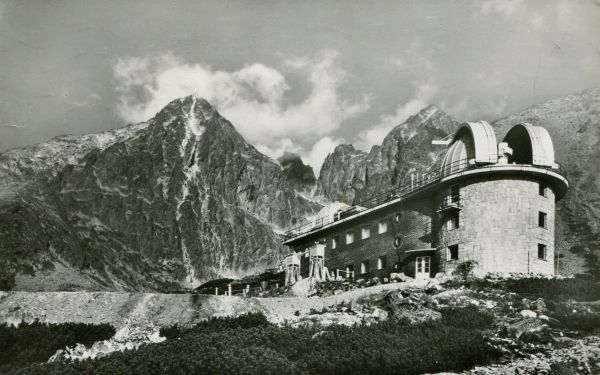 Tatry Wysokie - Państwowe Obserwatorium nad Łomnickim Stawem, w tle Łomnica i Kieżmarski Szczyt.
