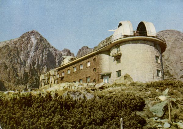 Obserwatorium Astronomiczne SAN nad Łomnickim Stawem. W tle Łomnica. Tytuł również w języku: ros., ang., niem.