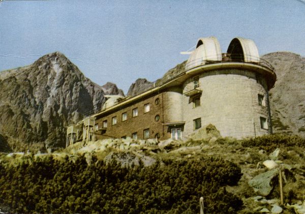 Obserwatorium Astronomiczne SAN nad Łomnickim Stawem. W tle Łomnica. Tytuł również w języku: ros., ang., niem.