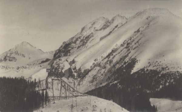 Zimowy widok na Szczyrbski Szczyt, Skrajn± Basztę i Szatana. Na pierwszym planie skocznia narciarska.