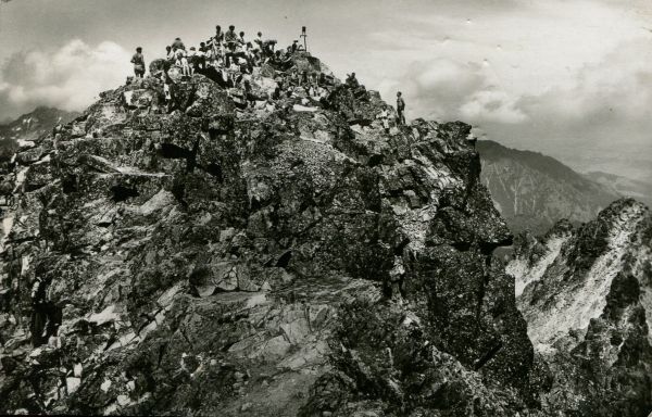 Widok na Rysy, na ich wierzchołku grupa turystów.