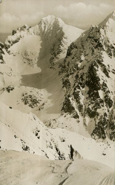 Widok na Rysy i Dolinę Mięguszowiecką w scenerii zimowej.