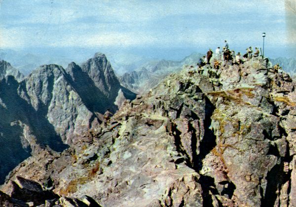 Widok z Rysów na zachód. Po prawej stronie wierzchołek Rysów, na którym znajduje się grupa turystów. Na lewo Mięguszowieckie Szczyty, najwyższy Mięguszowiecki Szczyt Wielki.