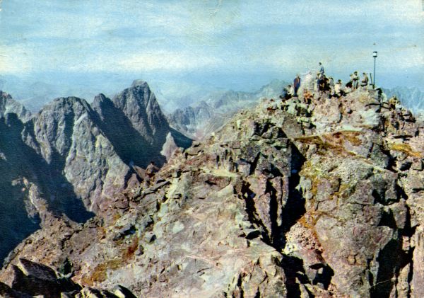 Widok z Rysów na zachód. Po prawej stronie wierzchołek Rysów, na którym znajduje się grupa turystów. Na lewo Mięguszowieckie Szczyty, najwyższy Mięguszowiecki Szczyt Wielki.