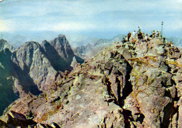 Widok z Rysów na zachód. Po prawej stronie wierzchołek Rysów, na którym znajduje się grupa turystów. Na lewo Mięguszowieckie Szczyty, najwyższy Mięguszowiecki Szczyt Wielki.