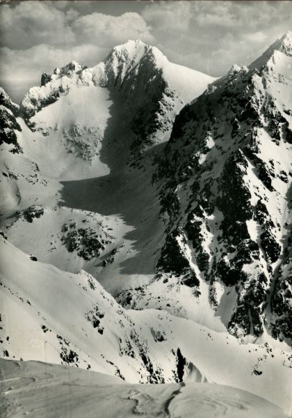 Widok na Rysy i Dolinę Mięguszowiecką w scenerii zimowej.