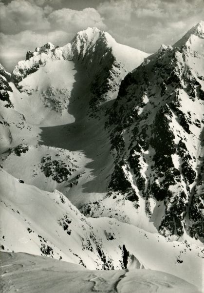 Widok na Rysy i Dolinę Mięguszowiecką w scenerii zimowej.