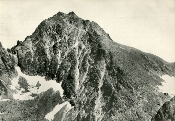 Widok na Rysy i Przełęcz Waga nad Doliną Mięguszowiecką. W prawym dolnym rogu schronisko pod Rysami (schronisko pod Wagą).