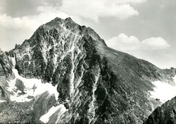 Widok na Rysy i Przełęcz Waga nad Doliną Mięguszowiecką. W prawym dolnym rogu schronisko pod Rysami (schronisko pod Wagą).