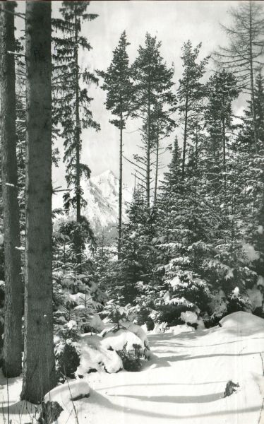 Widok z Tatrzańskiej Łomnicy. Na pierwszym planie zaśnieżona droga. W centralnej części drzewa, pomiędzy którymi wyłania się ośnieżony Sławkowski Szczyt.