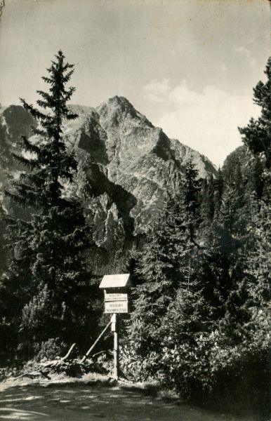 Widok na Sławkowski Szczyt z Magistrali Tatrzańskiej. Na pierwszym planie kierunkowskaz turystyczny, za nim las.