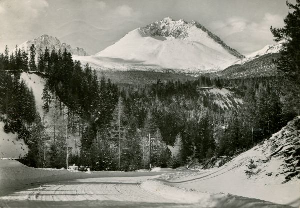 Widok na Kończystą i Gerlach w zimowej scenerii z Tatrzańskiej Polanki. Na pierwszym planie Droga Wolności, w głębi las.