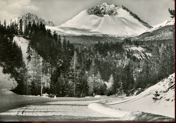 Widok na Kończystą i Gerlach w zimowej scenerii z Tatrzańskiej Polanki. Na pierwszym planie Droga Wolności, w głębi las.