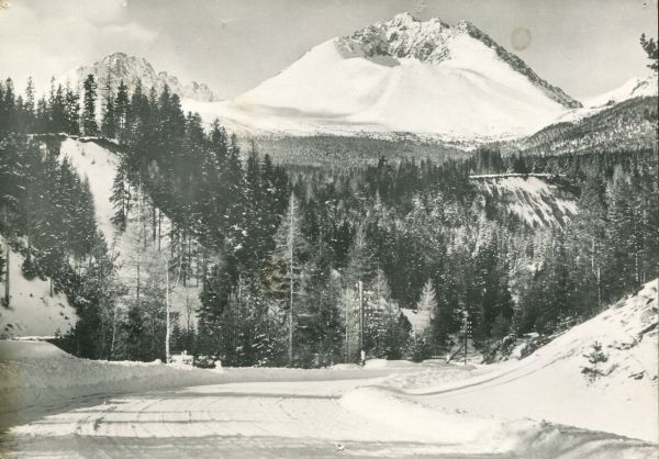 Widok na Kończystą i Gerlach w zimowej scenerii z Tatrzańskiej Polanki. Na pierwszym planie Droga Wolności, w głębi las.