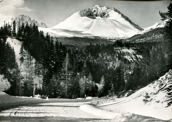 Widok na Kończystą i Gerlach w zimowej scenerii z Tatrzańskiej Polanki. Na pierwszym planie Droga Wolności, w głębi las.