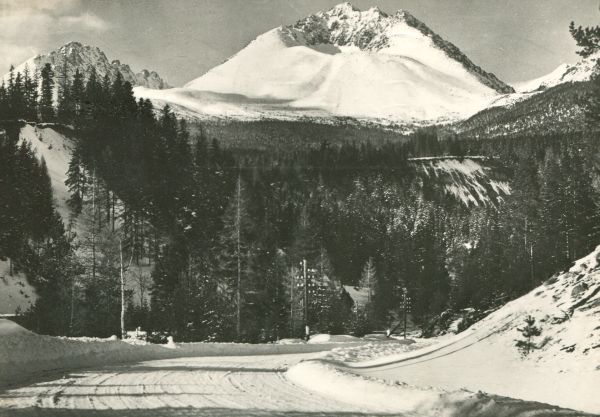 Widok na Kończystą i Gerlach w zimowej scenerii z Tatrzańskiej Polanki. Na pierwszym planie Droga Wolności, w głębi las.