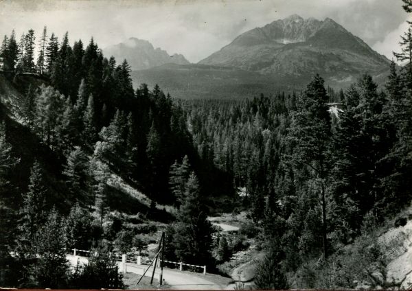 Widok na Kończystą i Gerlach z Tatrzańskiej Polanki. Na pierwszym planie las. W lewym dolnym rogu Droga Wolności.