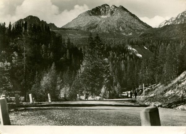 Widok na Gerlach z Tatrzańskiej Polanki. W tle po lewej stronie Kończysta. Na pierwszym planie Droga Wolności, po której idą 3 osoby. W głębi las.
