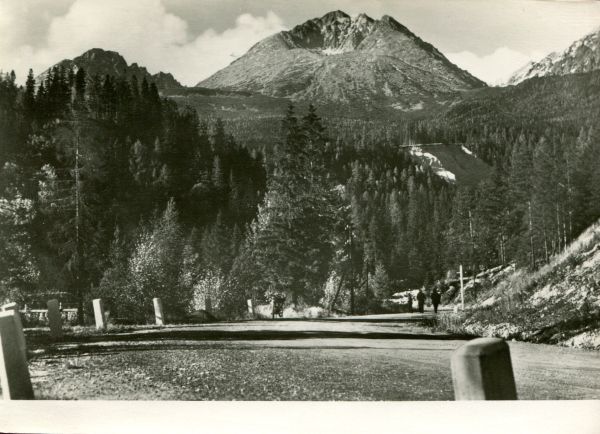 Widok na Gerlach z Tatrzańskiej Polanki. W tle po lewej stronie Kończysta. Na pierwszym planie Droga Wolności, po której idą 3 osoby. W głębi las.