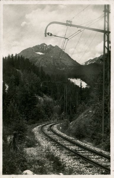 Widok na Gerlach z Tatrzańskiej Polanki. Na pierwszym planie tory kolei elektrycznej. W głębi las.
